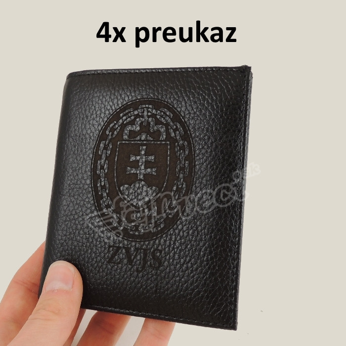 obal so štyrmi priečinkami na preukaz s vygravírovaným logom ZVJS a s priečinkom na papierové peniaze