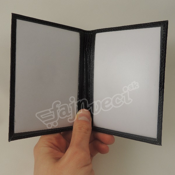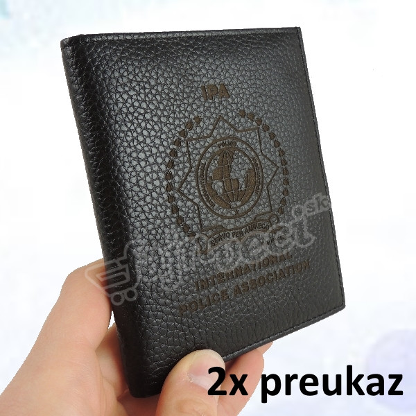 kožený obal s vygravírovaným logom IPA INT a s dvoma priečinkami na preukaz