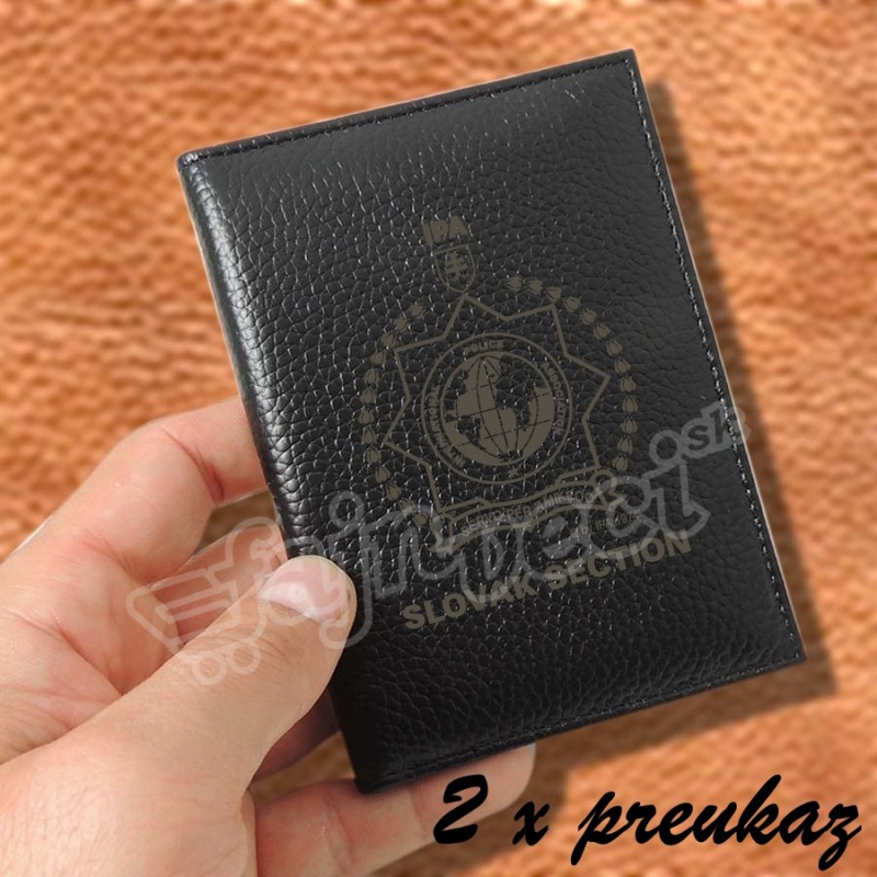 kožený obal s vygravírovaným logom IPA SLS a s dvoma priečinkami na preukaz