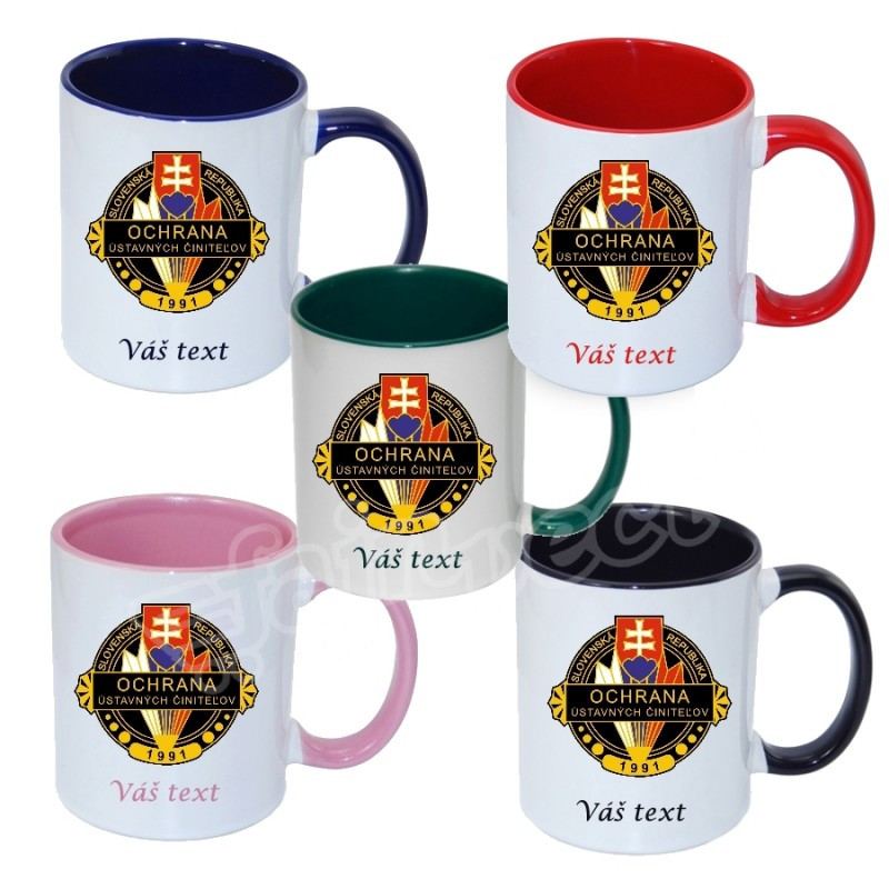 biely keramický hrnček s farebným interiérom a rukoväťou<br>