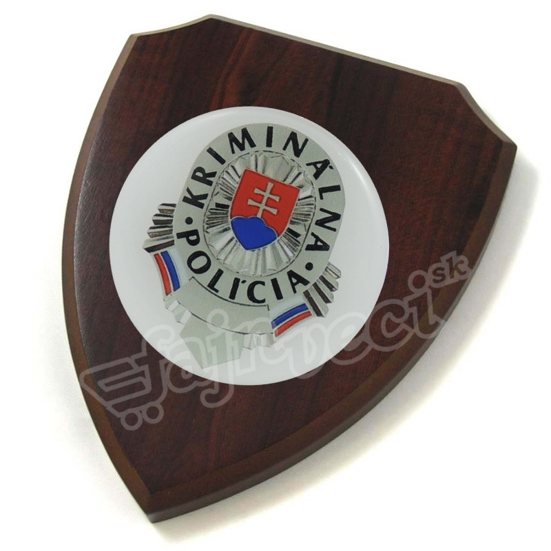 drevená plaketa s farebnou nálepkou kriminálnej polície