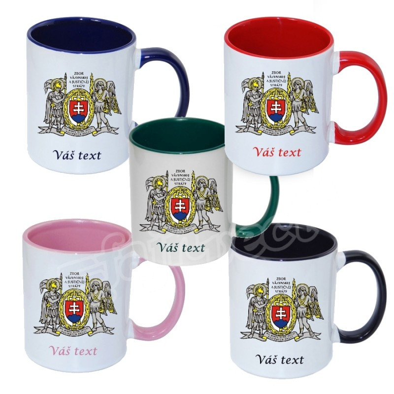biely keramický hrnček s farebným interiérom a rukoväťou<br>