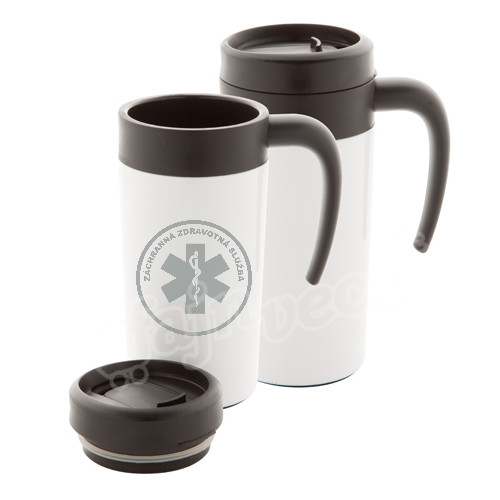 nerezový tenkostenný termohrnček s plastovým viečkom na pitie s uchom